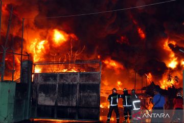 Petugas pemadam kebakaran berusaha memadamkan api yang membakar pabrik sandal di Medan, Sumatera Utara, Rabu (28/1/2026). Kebakaran terjadi pada Selasa (27/1) sekitar pukul 22.00 WIB dan sebanyak 20 unit mobil damkar dikerahkan untuk memadamkan kebakaran tersebut, termasuk bantuan mobil water Canon Brimob Polda Sumut. ANTARA FOTO/Yudi Manar/agr