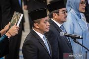 Menteri ESDM Bahlil Lahadalia (kiri) bersama Kalangan Akademisi Mohamad Fadhil Hasan (tengah) dan Kalangan Industri Sripeni Inten Cahyani (kanan) mengucapkan sumpah jabatan pada pelantikan Dewan Energi Nasional (DEN) di Istana Negara, Jakarta, Rabu (28/1/2026). Presiden Prabowo Subianto melantik 16 anggota Dewan Energi Nasional dari unsur pemerintahan dan pemangku kepentingan lainnya diantaranya Menteri ESDM sekaligus menjadi Ketua Harian DEN Bahlil Lahadalia, anggota DEN Menteri Keuangan Purbaya Yudhi Sadewa, Menteri Pertanian Andi Amran Sulaiman, Menteri LH Hanif Faisol Nurofiq, Menteri Perhubungan Dudy Purwagandhi dan Menteri Perindustrian Agus Gumiwang Kartasasmita. ANTARA FOTO/Bayu Pratama S/nz