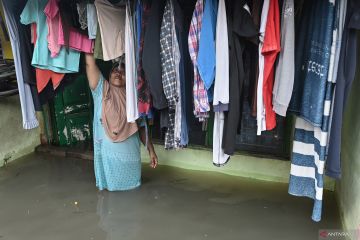 Warga menjemur pakaian di depan rumahnya yang terendam banjir di Kelurahan Kedaung Kali Angke, Cengkareng Jakarta, Kamis (29/1/2026). Badan Penanggulangan Bencana Daerah (BPBD) DKI Jakarta melaporkan saat ini terdapat 20 rukun tetangga (RT) serta lima ruas jalan di Jakarta Timur dan Barat yang terendam banjir dengan ketinggian setengah meter hingga 1,5 meter. ANTARA FOTO/Sulthony Hasanuddin/wsj.