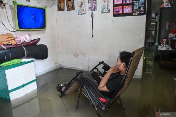 Warga menonton televisi di rumahnya yang terendam banjir di Kelurahan Kedaung Kali Angke, Cengkareng Jakarta, Kamis (29/1/2026). Badan Penanggulangan Bencana Daerah (BPBD) DKI Jakarta melaporkan saat ini terdapat 20 rukun tetangga (RT) serta lima ruas jalan di Jakarta Timur dan Barat yang terendam banjir dengan ketinggian setengah meter hingga 1,5 meter. ANTARA FOTO/Sulthony Hasanuddin/wsj.