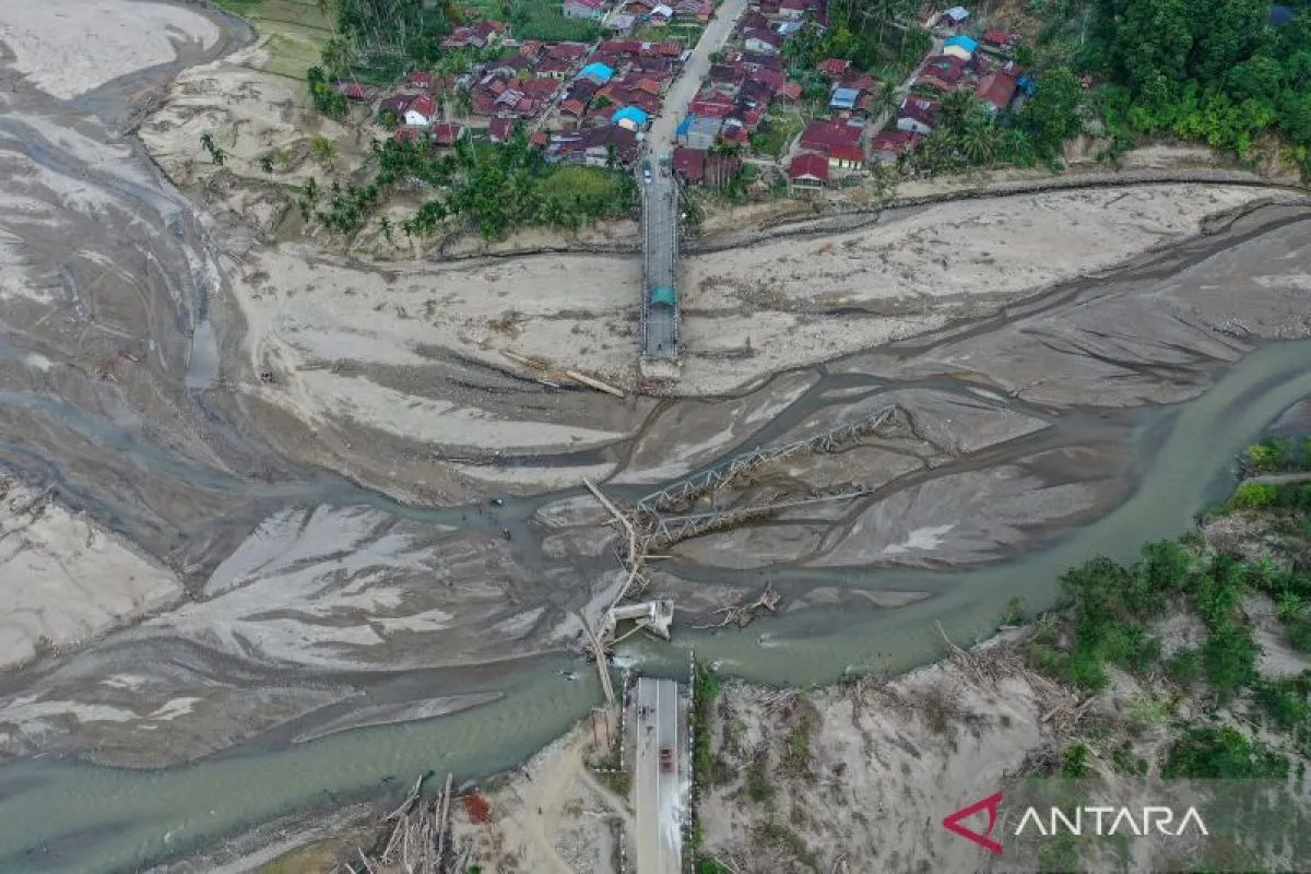 Foto udara jembatan yang putus menuju Kecamatan Pining, Kabupaten Gayo Lues, Aceh, Jumat (30/1/2026). Sebanyak dua jembatan menuju dua desa yang masih terisolasi mengalami kerusakan berat akibat bencana banjir bandang dan longsor yang terjadi pada akhir November 2025 lalu. ANTARA FOTO/Raisan Al Farisi/agr