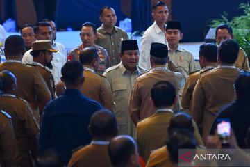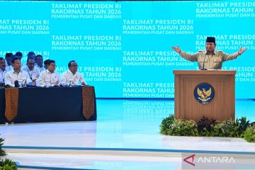 Presiden Prabowo Subianto (atas, kanan) menyampaikan taklimat dalam Rakornas Pemerintah Pusat dan Pemerintah Daerah 2026 di Sentul International Convention Center (SICC), Kabupaten Bogor, Jawa Barat, Senin (2/2/2026). Forum yang dihadiri jajaran pemerintah pusat, pemerintah daerah, pimpinan DPRD, TNI, Polri, Kejaksaan, BIN, dan BPS tersebut bertujuan memperkuat sinergi pusat dan daerah dalam mengimplementasikan program prioritas Presiden menuju Indonesia Emas 2045. ANTARA FOTO/Aditya Pradana Putra/nz