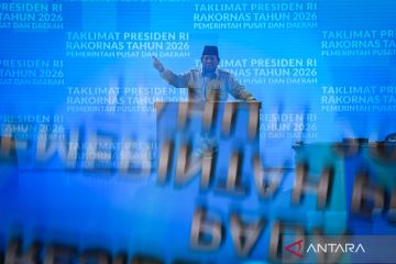 Presiden Prabowo Subianto menyampaikan taklimat dalam Rakornas Pemerintah Pusat dan Pemerintah Daerah 2026 di Sentul International Convention Center (SICC), Kabupaten Bogor, Jawa Barat, Senin (2/2/2026). Forum yang dihadiri jajaran pemerintah pusat, pemerintah daerah, pimpinan DPRD, TNI, Polri, Kejaksaan, BIN, dan BPS tersebut bertujuan memperkuat sinergi pusat dan daerah dalam mengimplementasikan program prioritas Presiden menuju Indonesia Emas 2045. ANTARA FOTO/Aditya Pradana Putra/nz