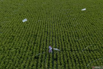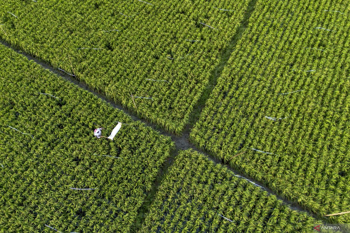 Foto udara petani mengusir hama burung di lahan sawah miliknya di Desa Pabean Udik, Indramayu, Jawa Barat, Selasa (3/2/2026). Badan Pusat Statistik (BPS) memproyeksikan produksi padi nasional pada periode Januari hingga Maret atau triwulan I 2026 mencapai 17,65 juta ton gabah kering giling (GKG) setara dengan 10,16 juta ton beras. ANTARA FOTO/Dedhez Anggara/wsj.