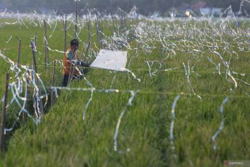 Petani mengusir hama burung di lahan sawah miliknya di Desa Pabean Udik, Indramayu, Jawa Barat, Selasa (3/2/2026). Badan Pusat Statistik (BPS) memproyeksikan produksi padi nasional pada periode Januari hingga Maret atau triwulan I 2026 mencapai 17,65 juta ton gabah kering giling (GKG) setara dengan 10,16 juta ton beras. ANTARA FOTO/Dedhez Anggara/wsj.