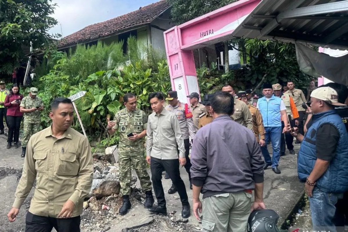 Wakil Presiden Gibran Rakabuming Raka (ketiga kiri) berjalan meninjau bencana tanah bergerak di Desa Padasari, Kabupaten Tegal, Jawa Tengah, Jumat (6/2/2026). Dalam kunjungan tersebut wapres menginstruksikan agar kebutuhan lansia, ibu hamil anak-anak, difabel terpenuhi dengan layak serta untuk kehilangan akta, surat dan sertifikat dapat diurus satu hari jadi dan relokasi tempat dengan hunian yang lebih aman. ANTARA FOTO/Oky Lukmansyah/foc.