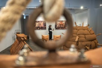 Pengunjung mengamati karya seni rupa saat pameran OpenOven di Galeri Seni Orbital Dago, Bandung, Jawa Barat, Sabtu (7/2/2026). Pameran tunggal dari seniman Loranita Theo yang berlangsung hingga 22 Februari tersebut menampilkan karya tiga dimensional berbentuk bantal yang dikombinasikan dengan elemen patung serta genteng berbahan terakota yang mencerminkan nilai-nilai keterbukaan, penerimaan, interaksi sosial, sekaligus kenyamanan secara personal maupun sosial. ANTARA FOTO/Abdan Syakura/wsj.