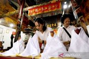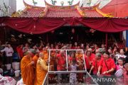 Sejumlah umat Tridharma mencuci arca di Kelenteng Tulus Harapan Kita di Kota Gorontalo, Gorontalo, Minggu (8/2/2026). Cuci arca merupakan ritual penyucian patung dewa-dewi yang melambangkan pembersihan diri dan hati agar suci dan tulus dalam menyambut tahun baru Imlek. ANTARA FOTO/Adiwinata Solihin/rwa.