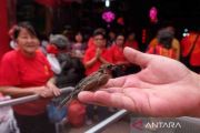 Peserta dipimpin bhikku melepaskan burung pipit pada rangkaian tradisi Pao Oen di halaman Klenteng Tien Kok Sie, Pasar Gede, Solo, Jawa Tengah, Minggu (8/2/2026). Pengelola klenteng setempat menggelar tradisi Pao Oen sebagai wujud penyatuan dengan alam dan proses penyucian diri untuk menyambut perayaan tahun baru Imlek. ANTARAFOTO/Maulana Surya/rwa.