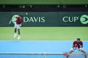 Petenis ganda putra Indonesia Justin Barki (kanan) dan Christopher Rungkat (kiri) mengembalikan bola ke arah petenis ganda putra Togo Kwami Stanislas Dussey dan Jean Paul Kadangah Killi pada babak playoff Grup Dunia II Piala Davis 2026 di Tenis Center Court Gelora Bung Karno, Jakarta, Minggu (8/2/2026). Justin Barki dan Christopher Rungkat menang dengan skor 6-0 dan 7-5 sekaligus memberikan keunggulan 3-0 atas tim Togo serta memastikan tim Indonesia lolos ke Grup Dunia II. ANTARA FOTO/Sulthony Hasanuddin/wpa.