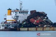 Bangkai KMP Tunu Pratama Jaya diangkat menggunakan Kapal tongkang Bercakar di Pelabuhan Marina Boom, Banyuwangi, Jawa Timur, Kamis (12/2/2026). Sebanyak 14 truk, 2 mobil dan 4 sepeda motor serta badan bangkai kapal KMP Tunu yang tenggelam pada 2 Juli 2025 berhasil dievakuasi hinggai 80 persen dan menyisakan bagian depan kapal yang belum terangkat. ANTARA FOTO/Budi Candra Setya/rwa.