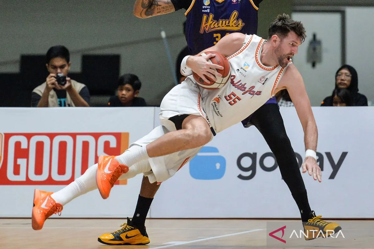Pebasket Pelita Jaya Jakarta Jeffree David Withey berusaha menghindari adangan pebasket Tangerang Hawks Joao Vitor Franca Dos santos (atas) pada pertandingan Indonesian Basketball League (IBL) 2026 di Indoor Stadium Sport Center, Kabupaten Tangerang, Banten, Minggu (15/2/2026). Pelita Jaya Jakarta mengalahkan Tangerang Hawks dengan skor 91-67. ANTARA FOTO/Putra M. Akbar/wpa.