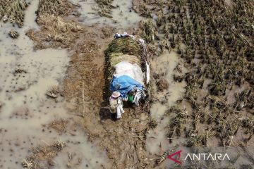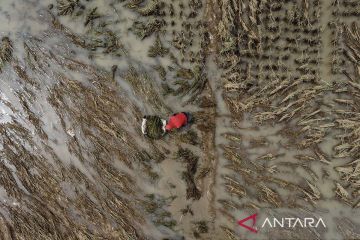Foto udara petani memanen padi lebih awal pascabanjir di Desa Bangunsari, Kecamatan Pamarican, Kabupaten Ciamis, Jawa Barat, Selasa (17/2/2026). BPBD Ciamis mencatat seluas 200 hektare lahan padi milik petani terendam banjir dan terpaksa dipanen lebih dini. ANTARA FOTO/Adeng Bustomi/rwa.