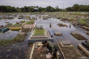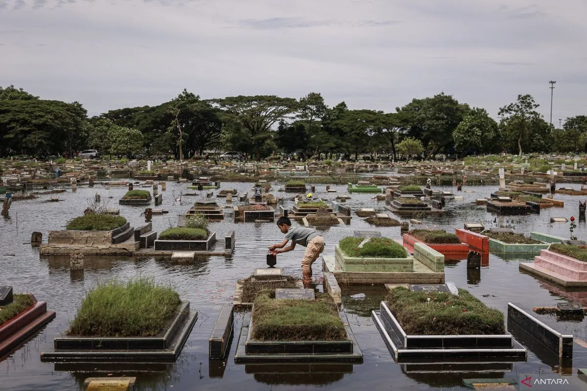 Warga menaburkan bunga saat berziarah di makam keluarga yang terendam banjir di TPU Semper, Jakarta, Selasa (17/2/2026). Menjelang bulan suci Ramadhan, umat Islam melakukan ziarah kubur untuk mendoakan keluarga dan kerabat yang sudah wafat. ANTARA FOTO/Dhemas Reviyanto/wsj.