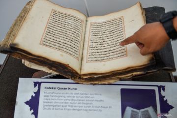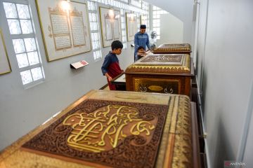 Pengunjung mengamati lembar Al Quran Sundawi yang dipamerkan di Galeri Quran, Pusat Studi Dakwah Islam (Pusdai), Bandung, Jawa Barat, Jumat (20/2/2026). Pameran Al Quran dengan hiasan yang memadukan kaligrafi dan ornamen khas budaya Jawa Barat tersebut digelar sebagai ajang pelestarian warisan keislaman dan budaya yang dikemas dalam pameran edukatif selama bulan suci Ramadhan 1447 H. ANTARA FOTO/Raisan Al Farisi/wsj.