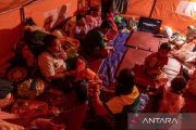 Pengungsi korban fenomena gerakan tanah (soil creep) berada di tenda darurat, Kelurahan Jangli, Kecamatan Tembalang, Kota Semarang, Jawa Tengah, Selasa (24/2/2026). Menurut BPBD Kota Semarang, peristiwa yang terjadi sejak Kamis (5/2) tersebut dipicu intensitas hujan tinggi yang meningkatkan kejenuhan tanah berkarakter lempung sehingga terjadi pergerakan tanah secara perlahan (creeping) yang mengakibatkan sekitar 15 rumah rusak berat hingga roboh serta memaksa 22 kepala keluarga atau sekitar 60 jiwa mengungsi ke tenda darurat. ANTARA FOTO/Aji Styawan/rwa.