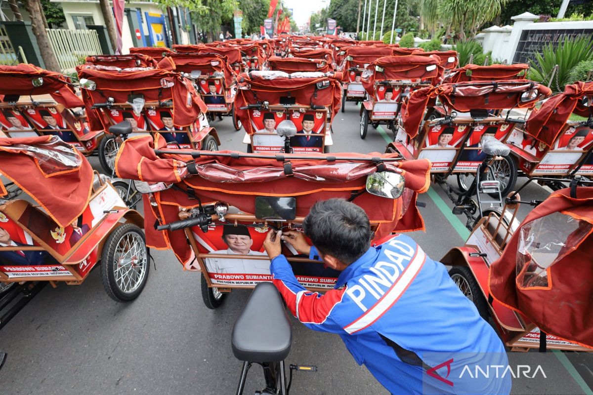 Seorang teknisi melakukan pengecekan becak listrik bantuan dari Presiden Prabowo Subianto di Kota Kediri, Jawa Timur, Rabu (25/2/2026). Sebanyak 200 unit becak listrik produksi PT Pindad tersebut disalurkan melalui Yayasan Gerakan Solidaritas Nasional sebagai upaya elektrifikasi angkutan roda tiga di Kota Kediri yang diberikan kepada tukang becak lanjut usia guna meningkatkan kesejahteraan mereka. ANTARA FOTO/Prasetia Fauzani/nz