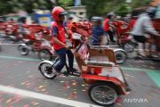 Sejumlah tukang becak mengendarai becak listrik bantuan dari Presiden Prabowo Subianto di Kota Kediri, Jawa Timur, Rabu (25/2/2026). Sebanyak 200 unit becak listrik produksi PT Pindad tersebut disalurkan melalui Yayasan Gerakan Solidaritas Nasional sebagai upaya elektrifikasi angkutan roda tiga di Kota Kediri yang diberikan kepada tukang becak lanjut usia guna meningkatkan kesejahteraan mereka. ANTARA FOTO/Prasetia Fauzani/nz