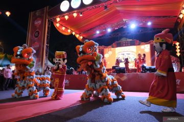 Dua boneka maskot Dewa Rejeki Chai Sin Ya dan dua barongsai tampil dalam pembukaan Festival Cap Go Meh di Jalan Diponegoro, Pontianak, Kalimantan Barat, Rabu (25/2/2026). Festival Cap Go Meh 2577 yang merupakan agenda tahunan Kota Pontianak dan digelar selama sepekan tersebut diramaikan dengan pentas seni budaya Tionghoa serta stan kuliner dan produk UMKM. ANTARA FOTO/Jessica Wuysang/wsj.