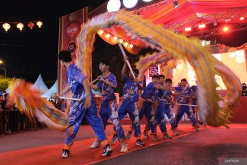 Sejumlah relawan Pemadam Kebakaran Panca Bhakti memainkan replika naga saat pembukaan Festival Cap Go Meh di Jalan Diponegoro, Pontianak, Kalimantan Barat, Rabu (25/2/2026). Festival Cap Go Meh 2577 yang merupakan agenda tahunan Kota Pontianak dan digelar selama sepekan tersebut diramaikan dengan pentas seni budaya Tionghoa serta stan kuliner dan produk UMKM. ANTARA FOTO/Jessica Wuysang/wsj.