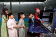 Badut syariah Yahya Edward melakukan trik sulap saat kegiatan dongeng Islami di Sudimara, Pinang, Kota Tangerang, Banten, Kamis (26/2/2026). Dongeng yang menceritakan keistimewaan orang yang membaca Al Quran tersebut dilakukan untuk mengedukasi nilai-nilai Islam sekaligus menghibur anak-anak sambil menunggu waktu berbuka puasa. ANTARA FOTO/Putra M. Akbar/YU