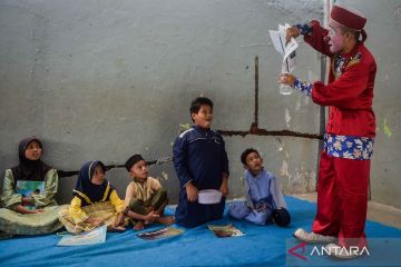 Badut syariah Yahya Edward (kiri) membaca buku cerita saat kegiatan dongeng Islami di Sudimara, Pinang, Kota Tangerang, Banten, Kamis (26/2/2026). Dongeng yang menceritakan keistimewaan orang yang membaca Al Quran tersebut dilakukan untuk mengedukasi nilai-nilai Islam sekaligus menghibur anak-anak sambil menunggu waktu berbuka puasa. ANTARA FOTO/Putra M. Akbar/YU