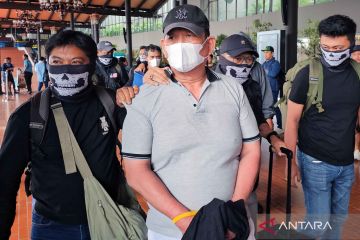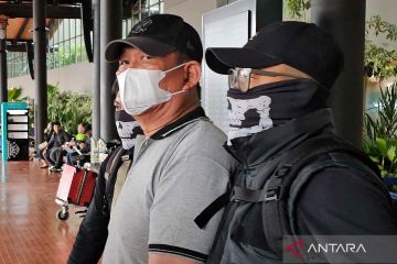 Petugas mengawal bandar narkoba Ko Erwin (kiri) setibanya dari Medan di Terminal 1 C Bandara Soekarno Hatta, Tangerang, Banten, Jumat (27/2/2026). Badan Reserse Kriminal Polri menangkap bandar narkoba Ko Erwin di Sumatera Utara saat berupaya melarikan diri ke Malaysia pada Kamis (26/2), dan kasusnya juga terkait penyuapan Rp1 miliar kepada mantan Kapolres Bima Kota AKBP Didik Putra Kuncoro serta menyeret Kasat Resnarkoba Polres Bima Kota AKP Malaungi. ANTARA FOTO/Muhammad Iqbal/nym.