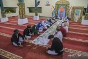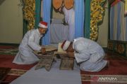 Seorang modin (pengurus masjid) mencium Al Quran tertua sebelum mengikuti tradisi khataman tadarus Al Quran di Masjid Kesultanan Ternate, Maluku Utara, Jumat (27/2/2026). Tradisi khataman Al Quran yang pertama di malam ke-10 Ramadhan itu digelar pengurus Masjid Kesultanan Ternate yang terdiri dari imam, khatib, dan modin karena telah menyelesaikan bacaan Al Quran 30 juz mulai pada awal Ramadhan untuk meningkatkan amal ibadah dan memohon ampunan dari Allah SWT sekaligus mempertahankan tradisi lokal bernuansa islami dengan melestarikan kearifan lokal yang diwariskan para leluhur mereka. ANTARA FOTO/Andri Saputra/agr