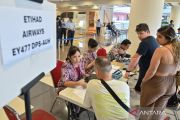 Petugas menyampaikan informasi kepada calon penumpang pesawat di area helpdesk penumpang Terminal Internasional Bandara Internasional I Gusti Ngurah Rai, Badung, Bali, Minggu (1/3/2026). Hingga Minggu (1/3/2026) siang tercatat sebanyak lima penerbangan internasional di Bandara Bali mengalami pembatalan dan penundaan keberangkatan sebagai dampak dari penutupan ruang udara di sejumlah negara Timur Tengah karena konflik AS-Israel dan Iran. ANTARA FOTO/Fikri Yusuf/sgd