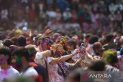 Sejumlah warga berswafoto saat mengikuti perayaan Festival Holi di Kathmandu, Nepal, Senin (2/3/2026). Festival tersebut menandai berakhirnya musim dingin dan dimulainya musim semi. ANTARA FOTO/Xinhua/Sulav Shrestha/rwa.