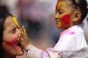 Seorang anak dan wanita berlumur bubuk berwarna saat perayaan Festival Holi di Kathmandu, Nepal, Senin (2/3/2026). Festival tersebut menandai berakhirnya musim dingin dan dimulainya musim semi. ANTARA FOTO/Xinhua/Sulav Shrestha/rwa.