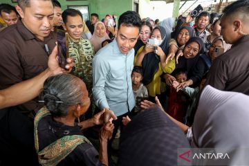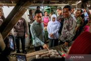 Wakil Presiden Gibran Rakabuming Raka (tengah) menyapa pedagang pasar saat meninjau Pasar Glondong di Tuban, Jawa Timur, Jumat (6/3/2026). Dalam kunjungannya Wapres Gibran Rakabuming Raka memantau secara langsung harga dan ketersediaan barang kebutuhan pokok selama bulan Ramadhan. ANTARA FOTO/Muhammad Mada/nz