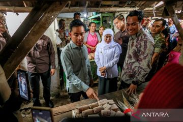 Wakil Presiden Gibran Rakabuming Raka (tengah) didampingi Gubernur Jawa Timur Khofifah Indar Parawansa (kedua kiri) dan Bupati Tuban Aditya Halindra Faridzky (kiri) berbincang dengan pedagang pasar saat meninjau Pasar Glondong di Tuban, Jawa Timur, Jumat (6/3/2026). Dalam kunjungannya Wapres Gibran Rakabuming Raka memantau secara langsung harga dan ketersediaan barang kebutuhan pokok selama bulan Ramadhan. ANTARA FOTO/Muhammad Mada/nz