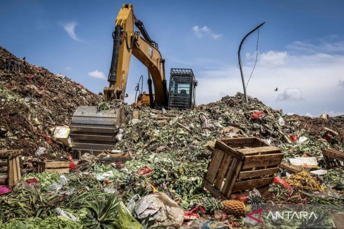 Sebuah alat berat mengeruk tumpukan sampah di Tempat Pembuangan Sementara (TPS) Pasar Induk Kramat Jati, Jakarta, Selasa (10/3/2026). Berdasarkan data Sistem Informasi Pengelolaan Sampah Nasional (SIPSN) sepanjang tahun 2025 sebanyak 40,62 persen dari 25,15 juta ton limbah merupakan sampah sisa makanan. ANTARA FOTO/Rakha Raditya Yahya/YU