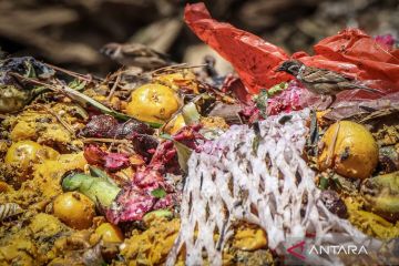 Seekor burung mencari makan di tumpukan sampah Pasar Induk Kramat Jati, Jakarta, Selasa (10/3/2026). Berdasarkan data Sistem Informasi Pengelolaan Sampah Nasional (SIPSN) sepanjang tahun 2025 sebanyak 40,62 persen dari 25,15 juta ton limbah merupakan sampah sisa makanan. ANTARA FOTO/Rakha Raditya Yahya/YU