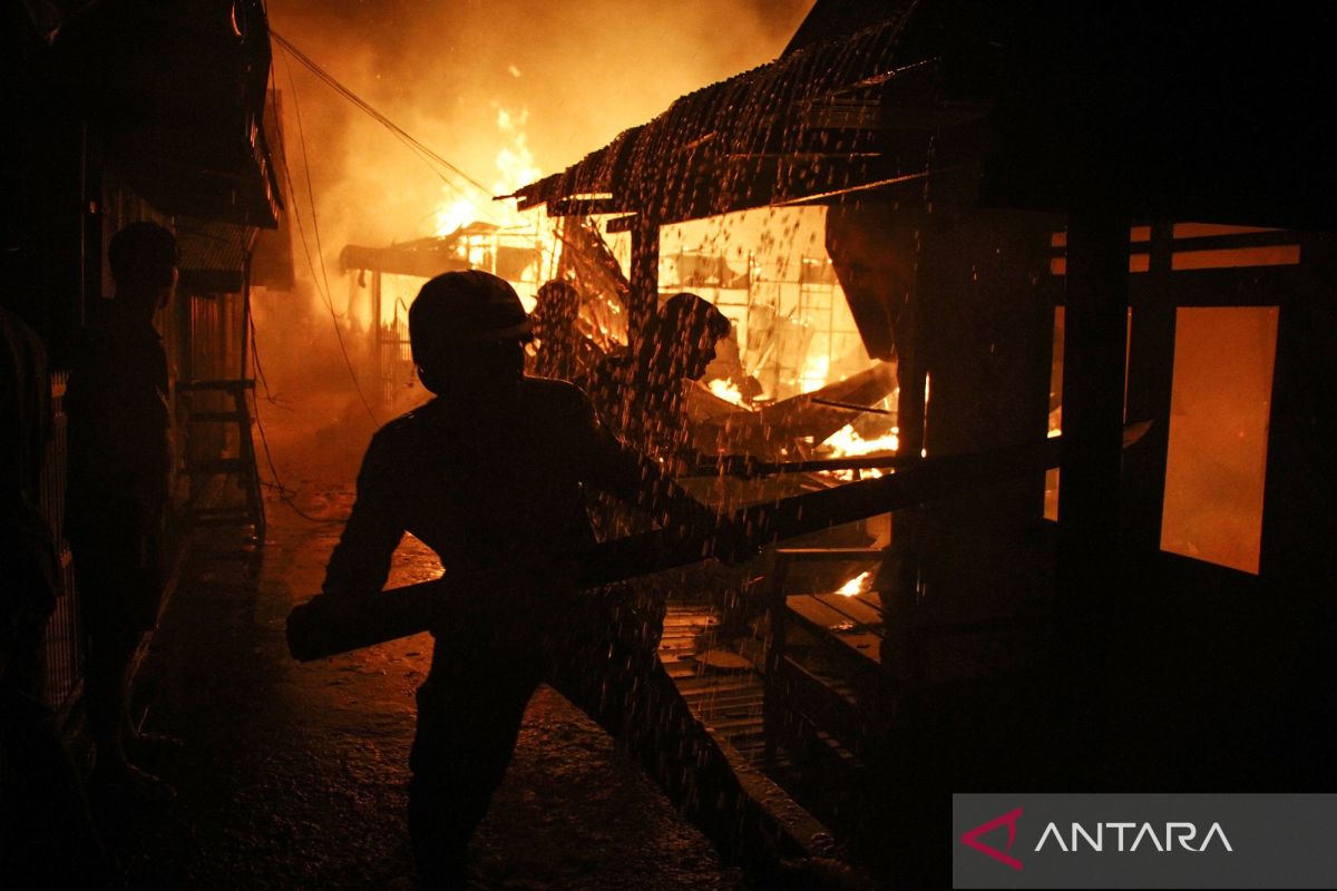 Petugas pemadam kebakaran berupaya memadamkan api yang membakar rumah di kawasan permukiman padat penduduk Kelurahan Panarung, Palangka Raya, Kalimantan Tengah, Selasa (10/3/2026). Kebakaran rumah dengan kontruksi dari kayu tersebut berdampak kepada sekitar 25 Kepala Keluarga (KK) dengan kerugian ditaksir mencapai Rp1,2 miliar, sementara penyebab kebakaran masih dalam penyelidikan. ANTARA FOTO/Auliya Rahman/bar