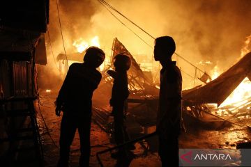 Warga melihat rumah terbakar di kawasan permukiman padat penduduk Kelurahan Panarung, Palangka Raya, Kalimantan Tengah, Selasa (10/3/2026). Kebakaran rumah dengan kontruksi dari kayu tersebut berdampak kepada sekitar 25 Kepala Keluarga (KK) dengan kerugian ditaksir mencapai Rp1,2 miliar, sementara penyebab kebakaran masih dalam penyelidikan. ANTARA FOTO/Auliya Rahman/bar