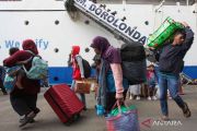 Penumpang berjalan menuju pintu keluar usai turun dari KM Dorolonda setibanya di Dermaga Jamrud Utara, Pelabuhan Tanjung Perak, Surabaya, Jawa Timur, Rabu (11/3/2026). Kapal dari Balikpapan itu menurunkan 2.653 pemudik di Surabaya. ANTARA FOTO/Didik Suhartono/nym.