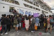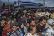 Pemudik antre untuk masuk ke dalam Kapal Motor (KM) Sinabung di Pelabuhan Ahmad Yani Ternate, Maluku Utara, Sabtu (14/3/2026). PT Pelni Cabang Ternate mencatat jumlah penumpang yang berangkat dari Pelabuhan Ahmad Yani Ternate sebanyak 1.570 pemudik tujuan Bitung, Banggai, Bau-Bau, Makassar, Balikpapan, dan Surabaya menggunakan KM Sinabung pada H-7 Lebaran. ANTARA FOTO/Andri Saputra/nym.