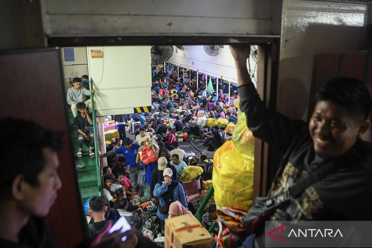 Sejumlah penumpang memenuhi geladak KM Prince Soya sebelum berlayar dari Pelabuhan Samarinda, Kalimantan Timur, Minggu (15/3/2026). Menurut data Kantor Kesyahbandaran dan Otoritas Pelabuhan (KSOP) Kelas I Samarinda jumlah pemudik yang menggunakan moda transportasi laut menuju Parepare, Sulawesi Selatan pada H-6 Lebaran berjumlah 1.697 orang penumpang. ANTARA FOTO/M Risyal Hidayat/bar