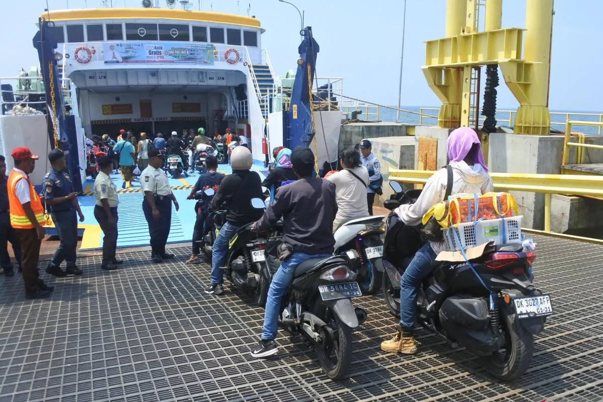 Calon penumpang antre memasuki kapal feri saat mudik gratis di Pelabuhan Jangkar, Situbondo, Jawa Timur, Minggu (15/3/2026). Gubernur Jawa Timur Khofifah Indar Parawansa melepas keberangkatan kapal feri pada program mudik gratis 2026 menggunakan kapal laut untuk penyeberangan rute Jangkar-Pulau Raas, dan Sumenep. ANTARA FOTO/Seno/foc.