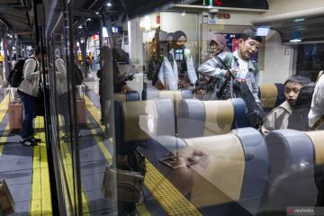 Sejumlah peserta mudik gratis bersama ANTARA memasuki gerbong KA Gumarang di Stasiun Pasar Senen, Jakarta, Minggu (15/3/2026). Kantor Berita ANTARA melalui program Tanggung Jawab dan Sosial Lingkungan (TJSL) memberikan 140 tiket mudik gratis kereta Gumarang tujuan Semarang dan Surabaya kepada masyarakat umum dengan tema Mudik Aman Berbagi Harapan. ANTARA FOTO/Rakha Raditya Yahya/foc.