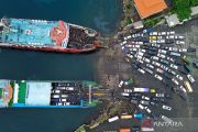 Foto udara sejumlah kendaraan pemudik antre memasuki kapal di Pelabuhan Gilimanuk, Jembrana, Bali, Minggu (15/3/2026). Memasuki H-6 Hari Raya Idul Fitri 1447 H, arus kendaraan melalui Pelabuhan Gilimanuk menuju Jawa terpantau padat akibat meningkatnya volume kendaraan pemudik. ANTARA FOTO/Budi Candra Setya/wsj.