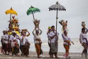 Umat Hindu berjalan sambil menyunggi sesaji pada prosesi Upacara Melasti di Pantai Tanjung Pakis, Karawang, Jawa Barat, Minggu (15/3/2026). Upacara Melasti yang diikuti ratusan umat Hindu itu bertujuan untuk membersihkan diri dan jiwa dari segala bentuk perbuatan buruk di masa lalu sekaligus sebagai rangkaian Hari Raya Nyepi Tahun Baru Saka 1948. ANTARA FOTO/Darryl Ramadhan/wsj.