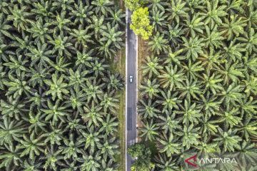 Foto udara kendaraan melintas di daerah perkebunan sawit di Jalan Ness, Batang Hari, Jambi, Senin (9/3/2026). Warga setempat menyebutkan volume kendaraan yang melintasi jalan alternatif mudik dari Jambi menuju Sumatera Barat tersebut terpantau mulai ramai terutama kendaraan dengan pelat nomor luar Jambi. ANTARA FOTO/Wahdi Septiawan/wsj.