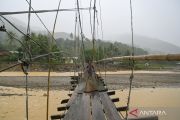 Seorang anak melintasi jembatan darurat di Desa Tetingi, Pantan Cuaca, Gayo Lues, Aceh, Senin (16/3/2026). Jembatan darurat yang dibangun oleh warga tersebut dapat membahayakan warga yang melintas karena hanya menggunakan bahan bangunan seadanya dari sisa bencana longsor dan banjir bandang 4 bulan lalu, sehingga warga berharap agar segera dibangun jembatan permanen di wilayah itu. ANTARA FOTO/Muhammad Adimaja/sgd