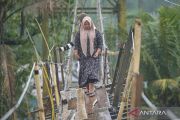 Warga melintasi jembatan darurat di Desa Tetingi, Pantan Cuaca, Gayo Lues, Aceh, Senin (16/3/2026). Jembatan darurat yang dibangun oleh warga tersebut dapat membahayakan warga yang melintas karena hanya menggunakan bahan bangunan seadanya dari sisa bencana longsor dan banjir bandang 4 bulan lalu, sehingga warga berharap agar segera dibangun jembatan permanen di wilayah itu. ANTARA FOTO/Muhammad Adimaja/sgd