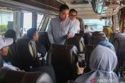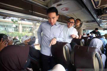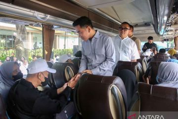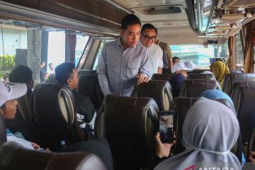 Wakil Presiden Gibran Rakabuming Raka (ketiga kanan) bersama Direktur Utama PT Danareksa (Persero) Yadi Jaya Ruchandi (kedua kanan) berbincang dengan peserta mudik gratis bersama Holding BUMN Danareksa 2026 sebelum melepas keberangkatannya di Jakarta, Selasa (17/3/2026). Program mudik gratis ini diikuti oleh 1.900 peserta dari 475 kepala keluarga yang berasal dari wilayah Jabodetabek yang menggunakan 39 armada bus dengan kota tujuan seperti Pulau Jawa, meliputi Solo, Yogyakarta, Surabaya, dan Bandung, Pulau Sumatra seperti Padang Sidempuan, serta di Pulau Sulawesi menembus wilayah Sidrap dan Bone. ANTARA FOTO/Muhammad Iqbal/YU