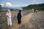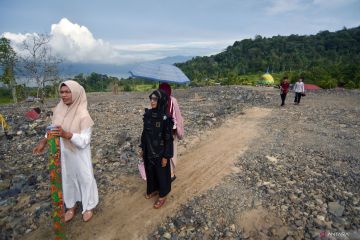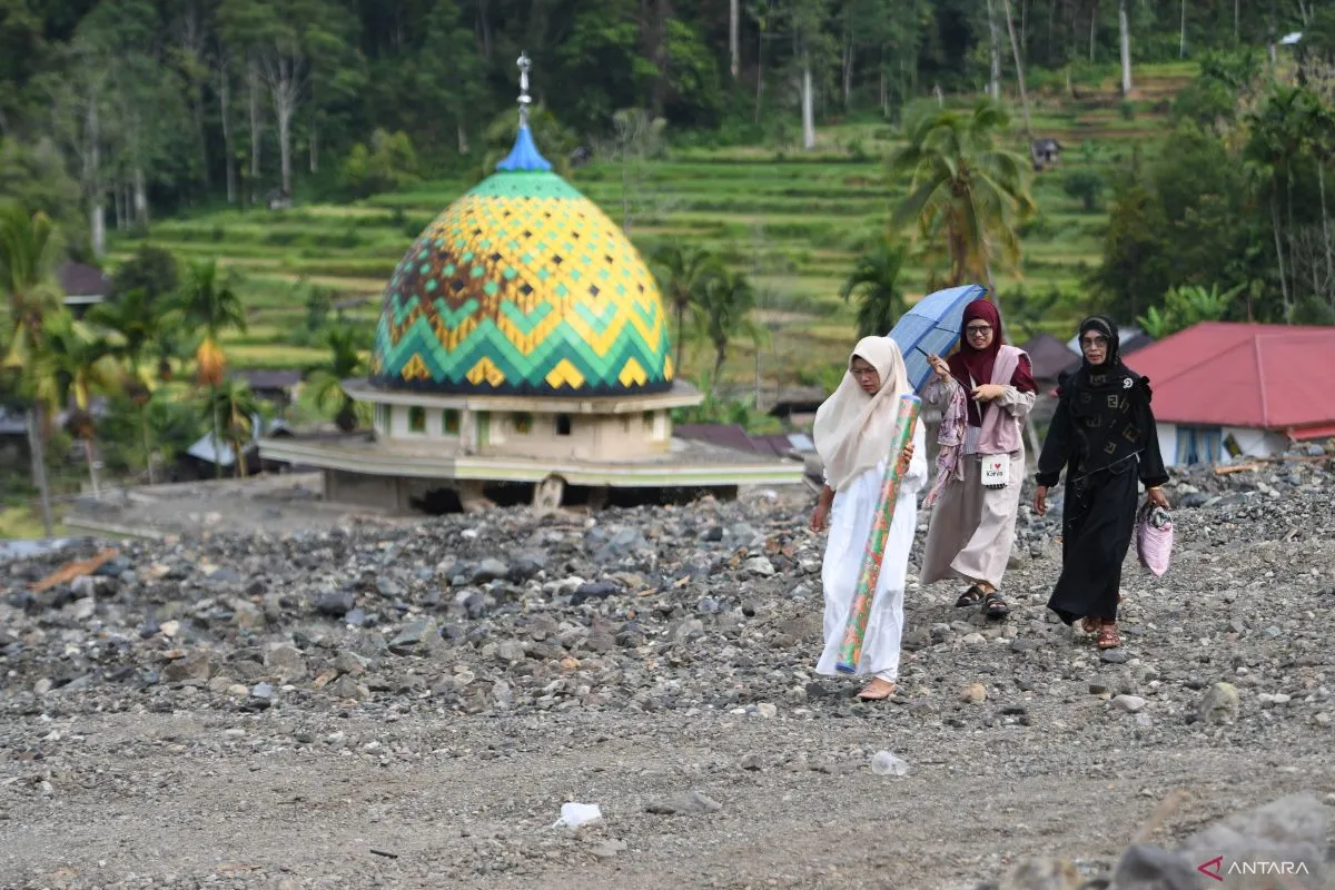 Warga melintas di depan masjid yang terkubur, saat berangkat shalat Idul Fitri di Jorong Labuah, Nagari Sungai Batang, Agam, Sumatera Barat, Jumat (20/3/2026). Masyarakat yang berada di lokasi terdampak bencana banjir bandang November 2025 khususnya warga Muhammadiyah melaksanakan shalat Idul Fitri 1447 Hijriyah di lokasi yang baru dibuka karena masjid mereka hancur terkubur pascabencana. ANTARA FOTO/Fitra Yogi/foc.