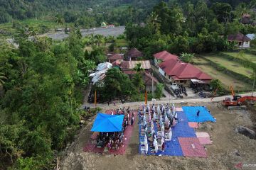 Foto udara warga mengikuti shalat Idul Fitri di Jorong Labuah, Nagari Sungai Batang, Agam, Sumatera Barat, Jumat (20/3/2026). Masyarakat yang berada di lokasi terdampak bencana banjir bandang November 2025 khususnya warga Muhammadiyah melaksanakan shalat Idul Fitri 1447 Hijriyah di lokasi yang baru dibuka karena masjid mereka hancur terkubur pascabencana. ANTARA FOTO/Fitra Yogi/foc.